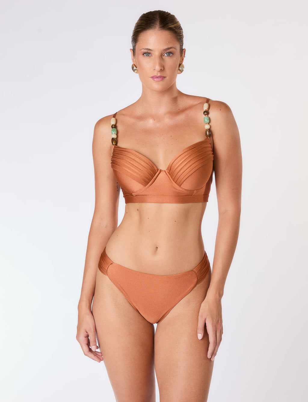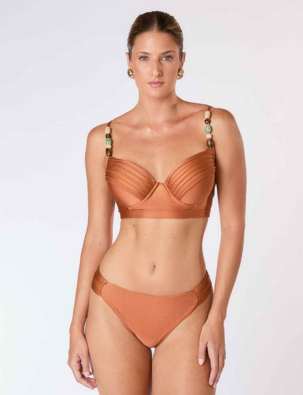Explore o Beachwear Premium com o Bquini artesanal detalhes drapeado e com pedraria conhaque.