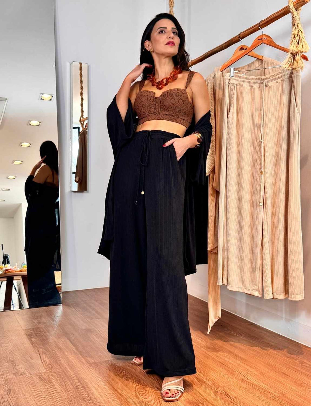 Descubra a coleção Kalini Beachwear e experimente como peças como a Calça Pantalona Preto Imperial traduzem o novo conceito de resortwear: leveza, elegância e autenticidade em cada passo.