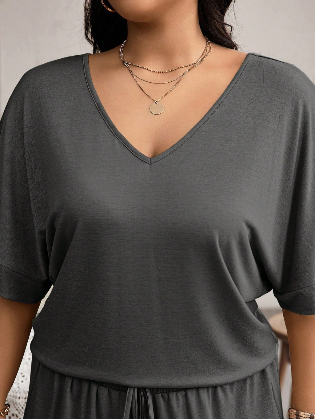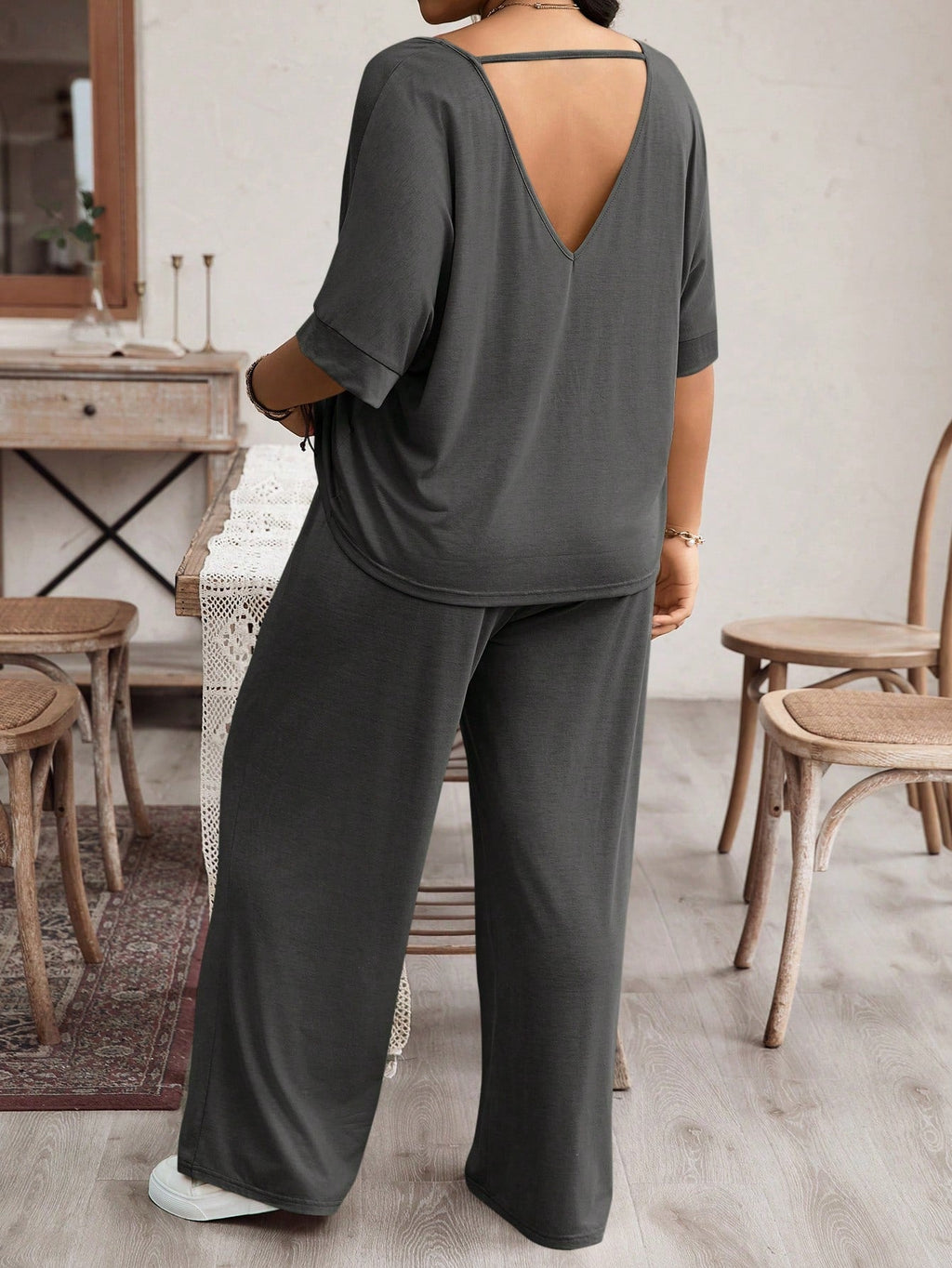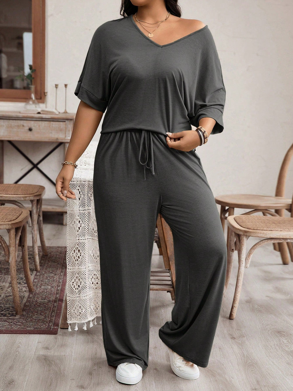 Conjunto Feminino camiseta com manga morcego e calça larga - Karol. Plus Size
