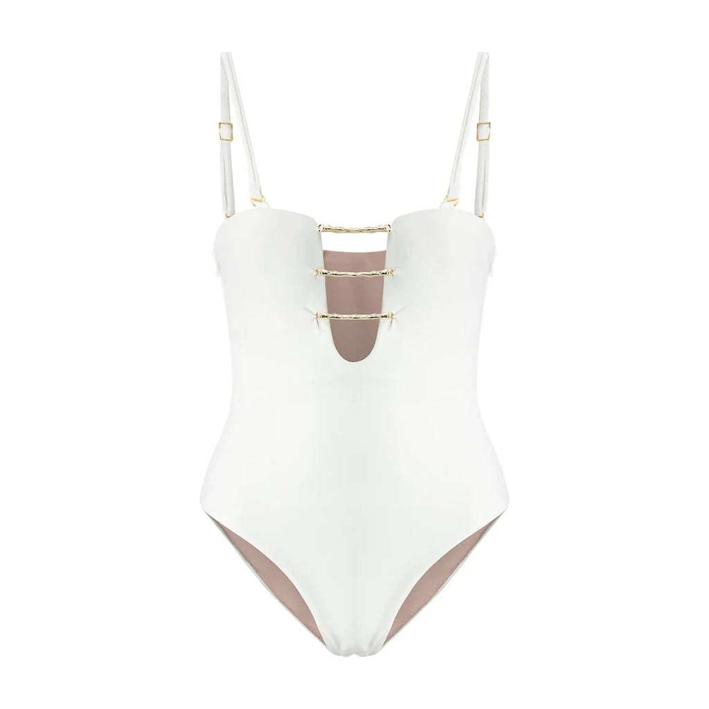 O Body Chris Off White é um modelo elegante e fashion com alça fina regulável. A peça possui decote em "V" com ferragens banhadas a ouro, trazendo um toque de modernidade para a peça. O modelo não possui bojo e é feito na nossa malha modeladora para criar uma siloueta aperfeiçoada.